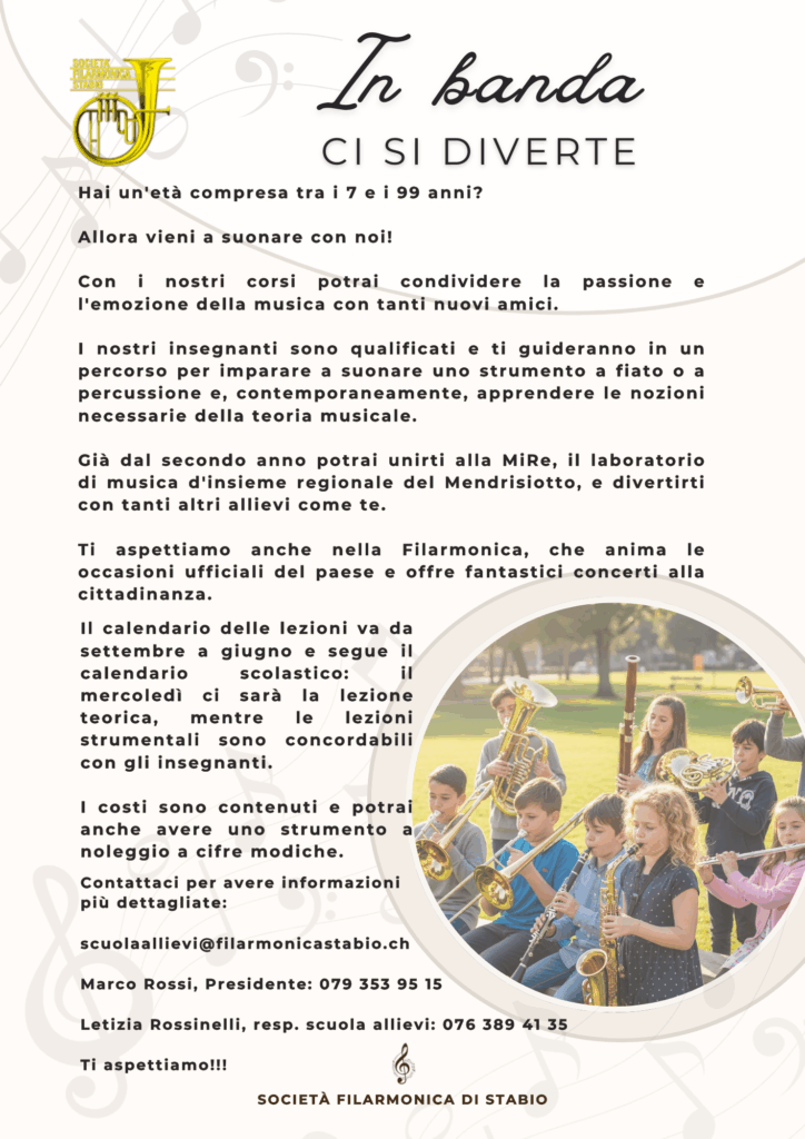 Per chi fosse interessato a imparare a suonare uno strumento musicale e desidera ricevere informazioni supplementari, si prega di contattare la scuola scrivendo all’indirizzo e-mail: scuolaallievi@filarmonicastabio.ch .